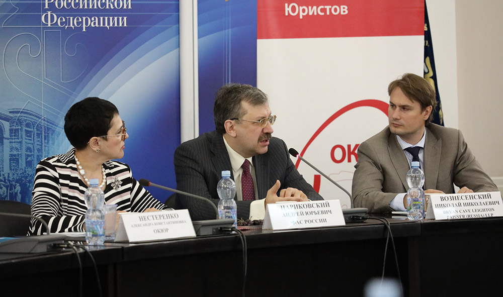 Cтатс-секретарь – заместитель руководителя ФАС России Андрей Цариковский и начальник Правового управления антимонопольного ведомства Артем Молчанов обсудили с членами ОКЮР актуальные для бизнеса вопросы антимонопольной политики.