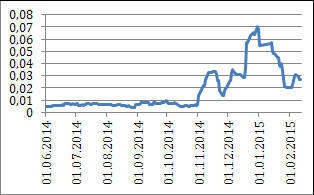 Однако гораздо более спорный вопрос о том, в чем именно проявляется или должно проявляться (что, конечно, не одно и то же) отличие антитраста в условиях, когда тренд экономической динамики более или менее понятен, а колебания параметров – существенных для принятия коммерческих решений – незначительны, от ситуации, когда уровень неопределенности по указанным параметрам резко возрастает. Он особенно актуален, поскольку именно такие изменения и произошли в 2014 – начале 2015 г. в российской экономике на фоне драматических изменений цен на нефть (в течение полугода падение более чем в два раза, а затем корректировка почти на треть), введения экономических санкций и контрсанкций, перехода Центрального банка РФ к политике по таргетированию инфляции, что сопровождалось фактической отменой валютного коридора, резким повышением ставки процента и драматическими колебаниями валютного курса (см. рисунок).